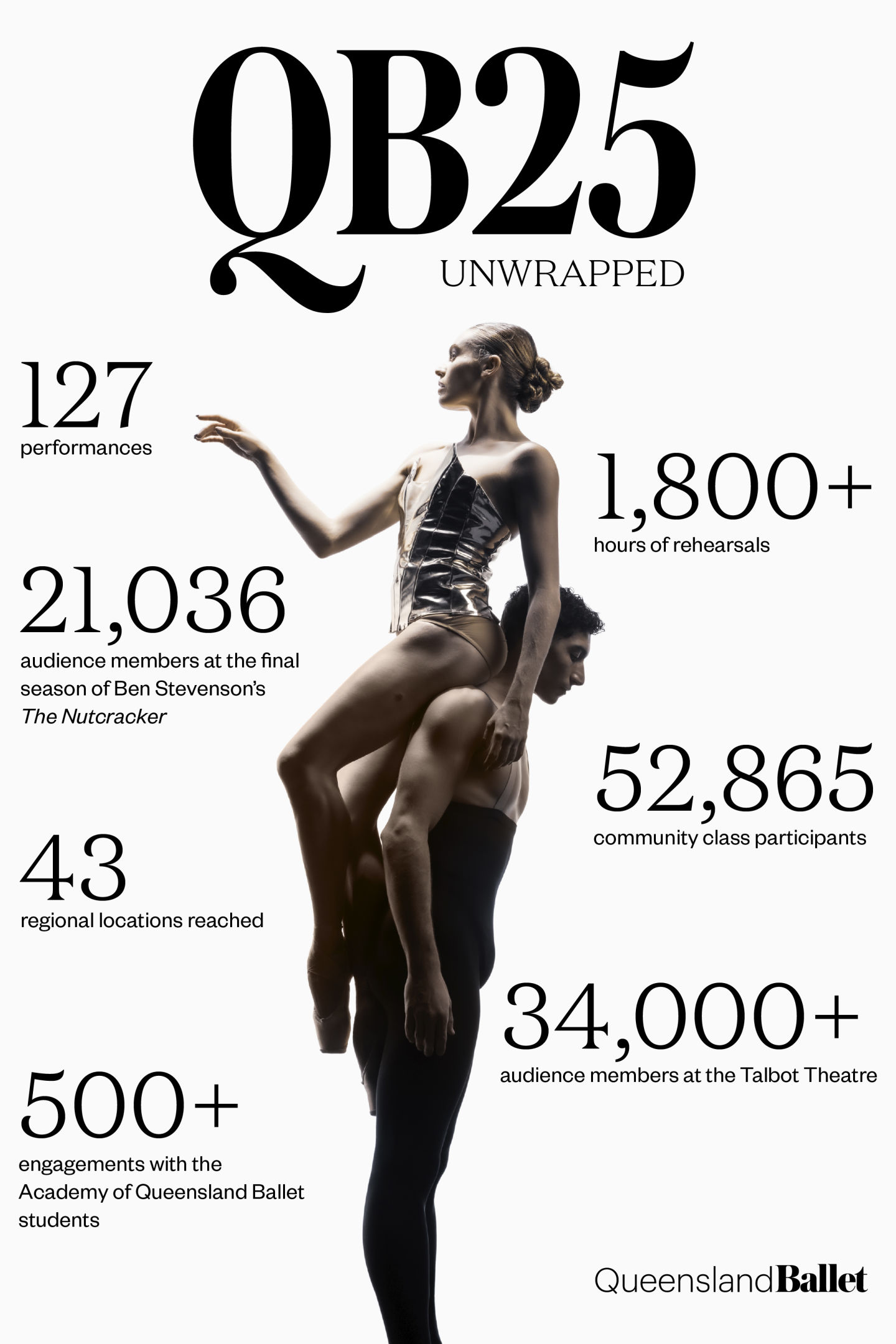 As 2025 draws to a close, we reflect on another incredible year at Queensland Ballet. From welcoming Artistic Director Ivan Gil-Ortega, to performing our final season of Ben Stevenson’s The Nutcracker to over 21,000 audience members – it truly was a year for the history books! Before the curtain closes on another year, take a look at some interesting stats from our 2025 year.